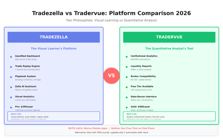 Tradezella and Tradervue represent two philosophies: gamified visual learning versus quantitative data analysis. This comparison examines pricing, features, and technical differences to help you choose the right platform—or skip both for a free alternative. The Core Difference Tradezella = Modern “Trading Operating System” with trade replay, playbooks, and gamification. Built for visual learners and prop…