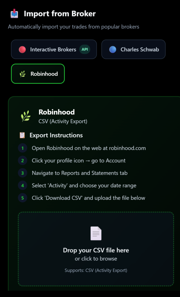 - Import inside the journal via the Trades tab, then Import from Broker, then select Robinhood