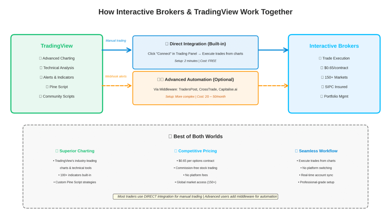 Combining both creates a professional setup: TradingView’s superior charting plus Interactive Brokers’ low-cost execution. This works best for active traders making 20+ monthly trades who rely on technical analysis. You get world-class charting tools while maintaining competitive execution costs—the optimal balance for serious traders.