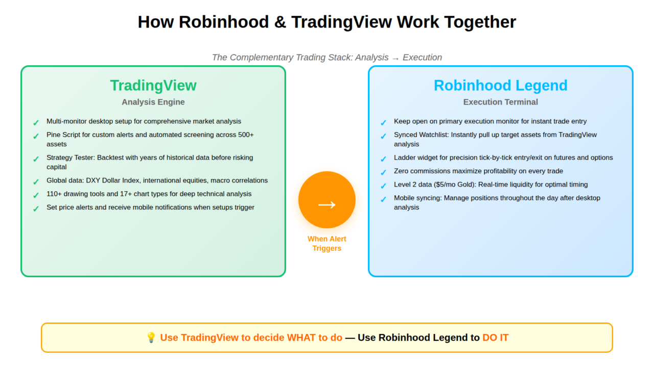 While no native integration exists, sophisticated traders use both platforms in a complementary workflow that leverages each platform’s unique strengths. The ideal approach treats TradingView as your analysis engine and Robinhood as your execution terminal.