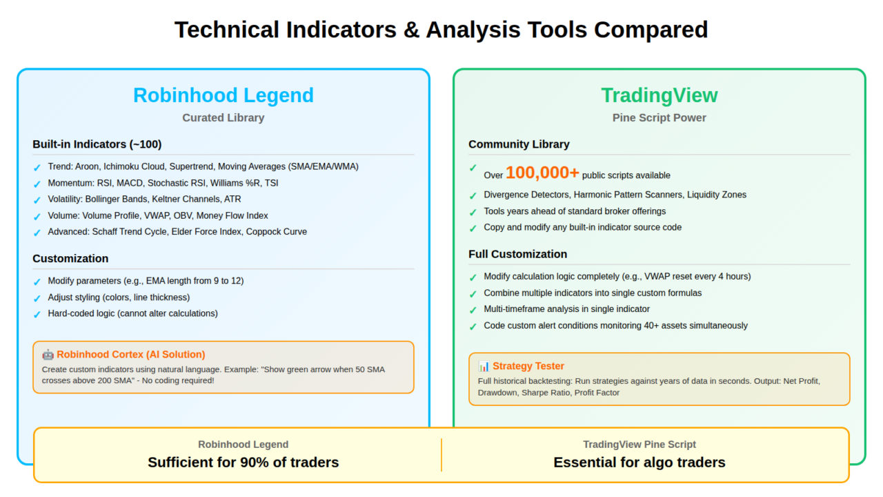 For discretionary traders using standard indicators, Robinhood Legend’s library suffices. For systematic traders developing custom strategies or algorithmic traders requiring robust backtesting, TradingView’s Pine Script is non-negotiable.