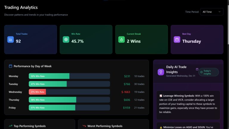 If you are searching for Tradervue alternatives, you are probably looking for one of three things: The Financial Tech Wiz Trading Journal offers a smarter alternative to Tradervue by giving traders two options that grow with them: You can start free, validate your strategy, and only upgrade when automation and AI insights actually add value….